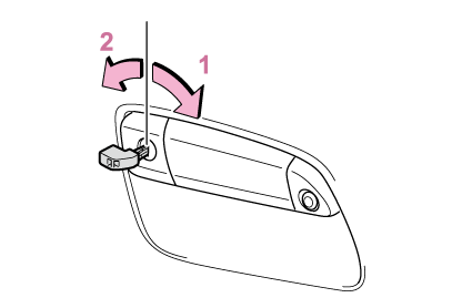 電子キーと車両間の通信がさまたげられたり(→機能が正常に働かないおそれのある状況)、電子キーの電池が切れたときは、スマートエントリー&スタートシステムとワイヤレスリモコンが使用できなくなります。このような場合、次の手順でドアを開けたり、エンジンを始動したりすることができます。