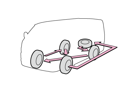 タイヤの摩耗を均等にし寿命をのばすために、タイヤローテーション(タイヤ位置交換)をFR車は10,000kmごとに、4WD車は5,000kmごとに行ってください。
