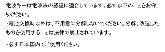 航空機に電子キーを持ち込む場合は、航空機内で電子キーのスイッチを押さないでください。また、かばんなどに保管する場合でも、簡単にスイッチが押されないように保管してください。スイッチが押されると電波が発信され、航空機の運行に支障をおよぼすおそれがあります。