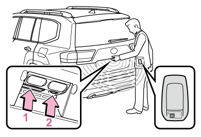 リヤバンパー運転席側の下部に足を近付けて離す動作をし、バックドアから十分に離れることで、バックドアを自動で閉じたあと全ドアを施錠することができます。キックセンサーを使用するときは、エンジンスイッチがOFF、かつキックセンサーの作動がONで、電子キーを携帯していることを確認してください。