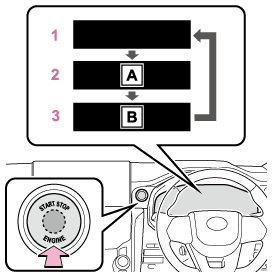 - エンジンスイッチを短く確実に押す指紋認証システムがONのときは、指紋認証に成功し、“ピッ”とブザーが鳴ったあと、約5秒以内にエンジンスイッチを押してください。時間がかかりすぎると、再度指紋認証をする必要があります。短く確実に押せば、押し続ける必要はありません。エンジンが始動するまで最大30秒間スターターが回転します。完全にエンジンが始動するまでブレーキペダルを踏み続けてください。ディーゼル車: