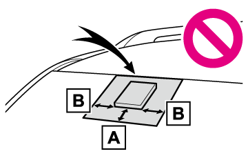 フロントウインドウガラスの前方カメラ前部(図に示す範囲内)にステッカー(透明なものを含む)などを貼り付けない
