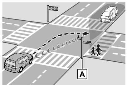 DSSS用路側装置が設置された交差点であっても、DSSS用路側装置の種類や交差点に進入する方向によっては、対向車のみを検知し、歩行者に対する注意喚起をしない場合があります。