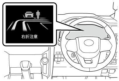 受信した情報は、状況に応じて通知・案内や注意喚起としてマルチインフォメーションディスプレイなどに表示され、運転者に注意をうながすことにより安全運転を支援します。