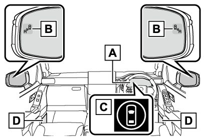 - ドアミラーインジケーター開いたドア(バックドアを除く)と衝突する可能性がある車両・自転車を検知したときは、検知した側のドアミラーインジケーター(→表示灯一覧)が点灯します。検知している側のドアを開いた場合は、ドアミラーインジケーターが点滅します。