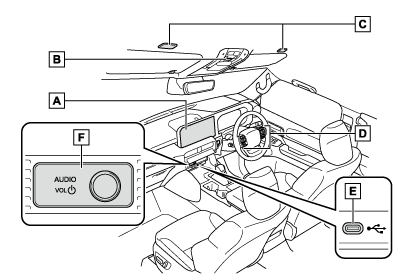 ディスプレイ(→ディスプレイと操作スイッチ)ヘルプネットスイッチ(→ヘルプネットスイッチパネル)マイク(→マイク位置、 通話音声の留意事項、 ヘルプネットスイッチパネル)ステアリングスイッチオーディオを操作する(→ステアリングスイッチで操作する, ステアリングスイッチでソースを変更する)音声操作システムを使用する(→トークスイッチを押す)電話をかける(→ステアリングスイッチで操作する)USB Type-C端子(→USB機器を接続する)POWER/VOLUMEノブ(→ディスプレイと操作スイッチ)