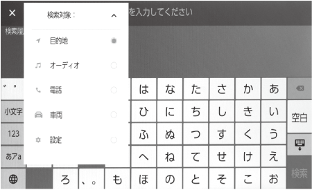 [オーディオ]:アルバム/アーティスト/曲名/プレイリスト/ジャンル/放送局名などを検索できます。[電話]:電話帳に登録されている名称/電話番号などを検索できます。[車両]:車両情報を検索できます。