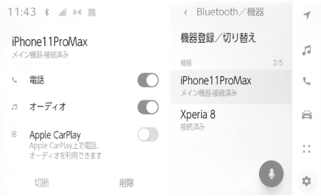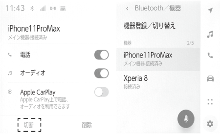 Apple CarPlayで接続中の機器は、Bluetooth®機能が使用できません。