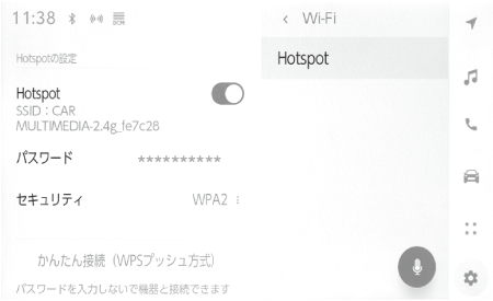 Apple CarPlayをワイヤレス接続しているときは、Wi-Fi Hotspotは同時に使用できません。Apple CarPlayをご利用の場合は、USB Type-C ケーブル接続にてご利用ください。