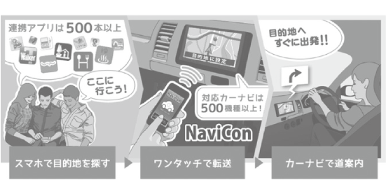 NaviConは多彩な連携アプリで探した行先を、ワンタッチでカーナビに転送し目的地に設定できるお出かけサポートアプリです。