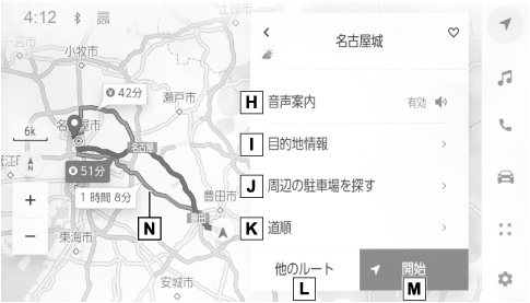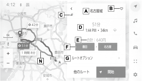 - 目的地案内を開始します。長押しすると目的地案内のデモを開始します。(→目的地案内のデモを見る)施設を目的地に設定した場合は、営業時間などが表示される場合があります。