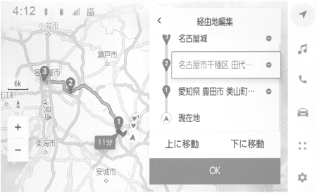 ルート上に設定している経由地の順番の変更、および削除ができます。