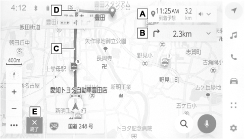 - 目的地案内中、直近の通過および分岐する交差点に表示されます。