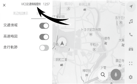 現況VICS情報を受信すると[VICS交通情報提供]が黒色に点灯し、現況交通情報のみを受信すると[VICS交通情報提供]は薄墨色になります。