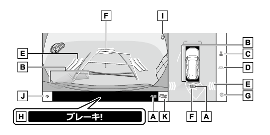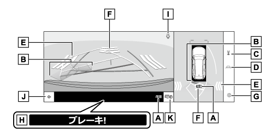 - 後方予想進路線ハンドル操作と連動して、進路の目安(黄色)を示します。