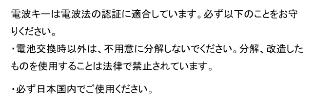 航空機に電子キーを持ち込む場合は、航空機内で電子キーのスイッチを押さないでください。また、かばんなどに保管する場合でも、簡単にスイッチが押されないように保管してください。スイッチが押されると電波が発信され、航空機の運行に支障をおよぼすおそれがあります。