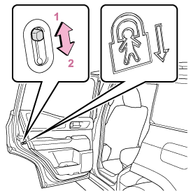 お子さまをリヤ席に乗せるときは、チャイルドプロテクターを使用して車内からドアが開かないようにする