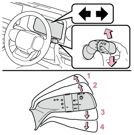 レバー操作により、次のように運転者の意思を表示することができます。左折左側へ車線変更(レバーを途中まで動かして離す)左側方向指示灯が5回点滅します。右側へ車線変更(レバーを途中まで動かして離す)右側方向指示灯が5回点滅します。右折