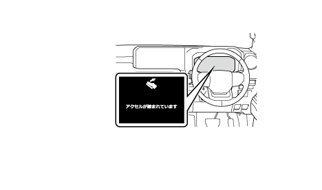 低速走行時にアクセルペダルが強く踏み込まれ、衝突の可能性があるとシステムが判断したとき、エンジン出力を抑制または弱いブレーキをかけることで加速を抑制します。作動時には、ブザー音が鳴り、マルチインフォメーションディスプレイに図で示すアイコンとメッセージを表示します。