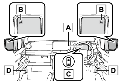 - ドアミラーインジケーター開いたドア(バックドアを除く)と衝突する可能性がある車両・自転車を検知したときは、検知した側のドアミラーインジケーター(→表示灯一覧)が点灯します。検知している側のドアを開いた場合は、ドアミラーインジケーターが点滅します。