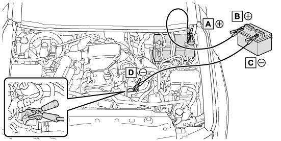 指定の端子および接続箇所以外にブースターケーブルを接続しないでください。電子機器に悪影響をおよぼしたり、破損につながったりするおそれがあります。