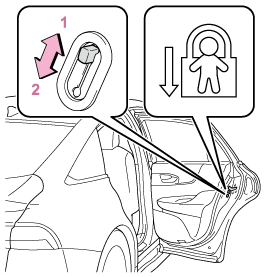 お子さまをリヤ席に乗せるときは、チャイルドプロテクターを使用して車内からドアが開かないようにする