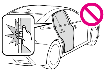 傾斜地・ドアと壁などのあいだが狭い場所・強風など、周囲の状況を確認し、予期せぬ動きにも対処できるよう、ドアハンドルを確実に保持してドアを開閉してください。
