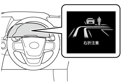 受信した情報は、状況に応じて通知・案内や注意喚起としてマルチインフォメーションディスプレイなどに表示され、運転者に注意を促すことにより安全運転を支援します。