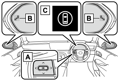 - 運転支援情報表示灯ブラインドスポットモニターがOFFのときに点灯し、マルチインフォメーションディスプレイにメッセージが表示されます。