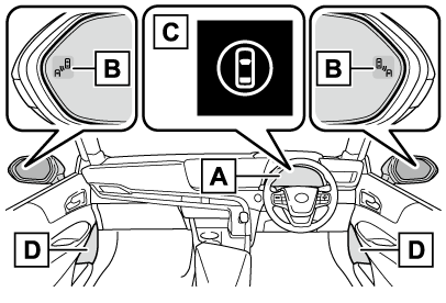 - 運転支援情報表示灯安心降車アシストがOFFのときに点灯し、マルチインフォメーションディスプレイにメッセージが表示されます。