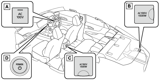 車内において、AC100Vで消費電力の合計が1500Wの電気製品を使用することができるシステムです。(→アクセサリーコンセントを使用するには)