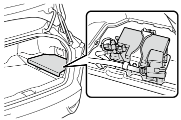 この車両の補機バッテリーはトランク(運転席側)のカバー内にあり、FCユニットルームには搭載されていません。