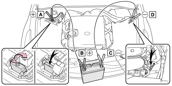 - 電子キーを携帯していることを確認するブースターケーブル接続時、場合によっては、オートアラームが作動し自動的にドアが施錠されます。(→オートアラーム作動によるドアロック機能)