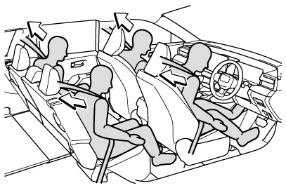 前方・側方から強い衝撃を受けたとき、フロント席・リヤ外側席のシートベルトを引き込むことで適切な乗員拘束効果を確保します。