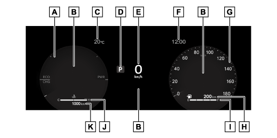 ハイブリッドシステムの出力や回生レベルを示します。(→ハイブリッドシステムインジケーター