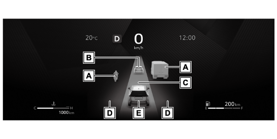 マルチインフォメーションディスプレイ(→マルチインフォメーションディスプレイ)に自車線・隣接する車線の状況や自車の動き、一部のシステムの作動状況を表示します。