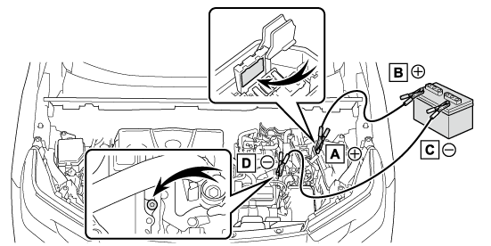 指定の端子および接続箇所以外にブースターケーブルを接続しないでください。電子機器に悪影響をおよぼしたり、破損につながったりするおそれがあります。