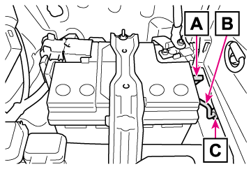 補機バッテリー端子をはずすと、コンピューターに記憶されている情報が消去されます。補機バッテリー端子をはずすときは、トヨタ販売店にご相談ください。