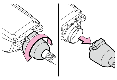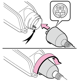 6. コントロールユニット接合部の突起と、電源プラグコードコネクターの溝とを合わせて挿し込み、電源プラグコードのナット部をまわして取り付ける