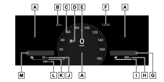 毎分のエンジン回転数を示します。アナログスピードメーター:車両の走行速度を示します。ハイブリッドシステムインジケーター:ハイブリッドシステムの出力や回生レベルを示します。(→ハイブリッドシステムインジケーター)ドライブモード連動: