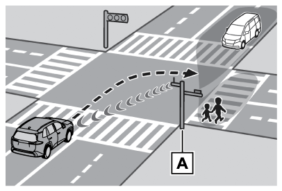 DSSS用路側装置が設置された交差点であっても、DSSS用路側装置の種類や交差点に進入する方向によっては、対向車のみを検知し、歩行者に対する注意喚起をしない場合があります。