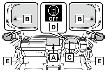 - ドアミラーインジケーター開いたドア(バックドアを除く)と衝突する可能性がある車両・自転車を検知したときは、検知した側のドアミラーインジケーター(→表示灯一覧)が点灯します。検知している側のドアを開いた場合は、ドアミラーインジケーターが点滅します。