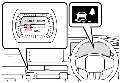 トレイルモードは、4WD・ブレーキ・駆動力などを統合制御し、タイヤの空転を抑えます。凹凸のある路面等を走行するときに、使用してください。