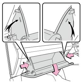 - グローブボックス側面を内側に押して上部のツメを片側ずつはずし、グローブボックスを支えながらゆっくりと全開させる