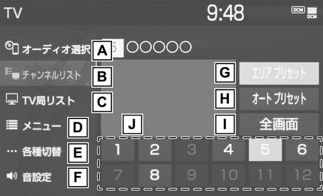 地上デジタルTVを初めてご利用になる場合や、すべてのプリセットスイッチにチャンネル番号が表示されていない場合、チャンネル設定が行われていません。初期スキャンを行ってください。(→機能設定画面について)