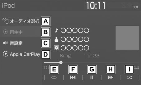 iPod/iPhone 操作画面を表示するにはオーディオソース選択画面で“iPod”/“iPod2”(機器名称)を選択します。