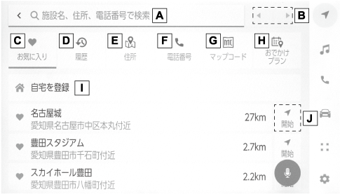 - お気に入り登録されている地点のリストを表示します。(→お気に入り地点を目的地に設定する)お気に入り地点を登録しているときのみ使用できます。