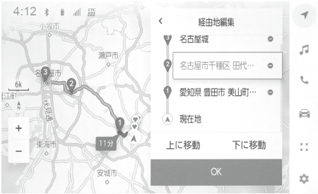 ルート上に設定している経由地の順番の変更、および削除ができます。