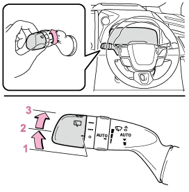 ウォッシャー液を出すレバーを前方へ押すとワイパーと連動してウォッシャーが作動します。カメラ洗浄システムも連動して作動します。