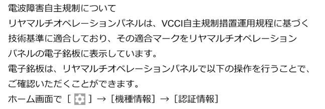 リヤマルチオペレーションパネルは、電波法に基づく特定無線設備の技術基準適合証明等に関する規則を順守しており、その証として「技適マーク」がリヤマルチオペレーションパネルの電子銘板に表示されております。